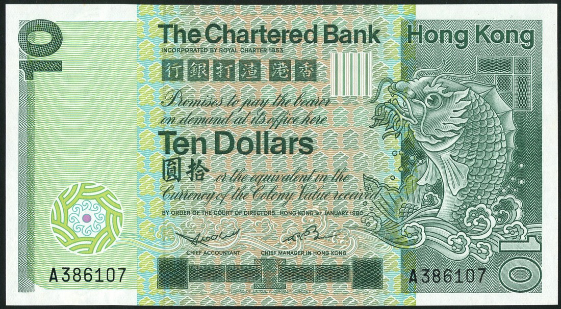 Standard Chartered Bank, $10, 1993, Chartered Bank, $10, 1980, both serial number A 386107,