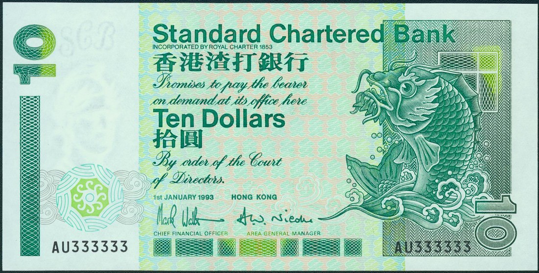 Standard Chartered Bank, $10, 1 Jan 1993, serial number AU333333, green