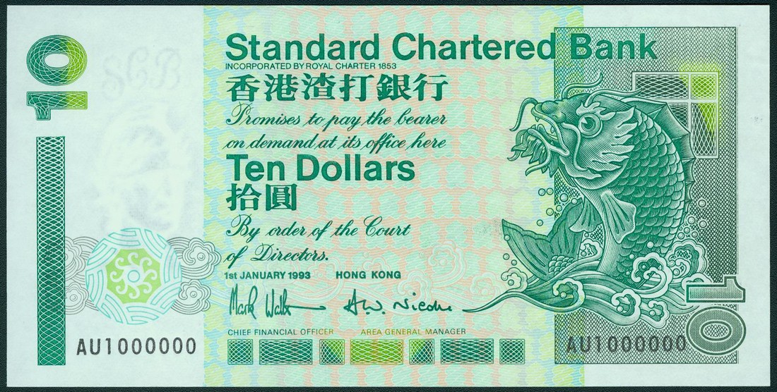 Standard Chartered Bank, $10 (2), 1 Jan 1993, serial number AU000001 and AU 1000000, green