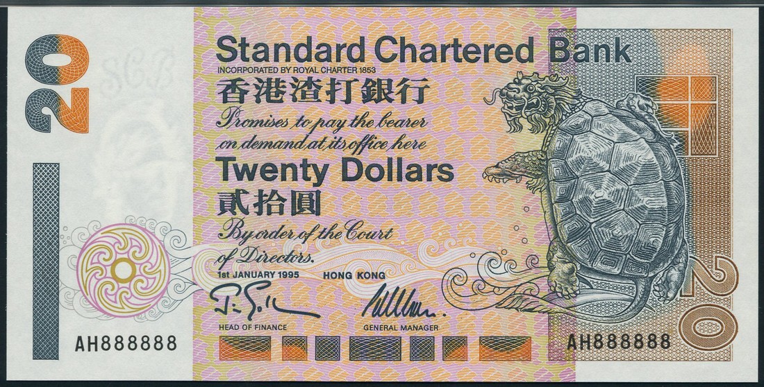 Standard Chartered Bank, $20, 1 January 1995, serial number AH 888888, pink and multicoloured, stylized tortoise at right, reverse dark grey, bank building at left