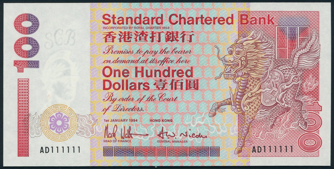 Standard Chartered Bank, $100 (2), 1 January 1994, serial number AD 111111, 222222 red and multicoloured, stylized horse at right