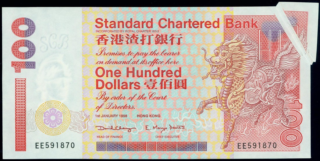 Standard Chartered Bank, $100, 1 January 1998, serial numbers EE591870, red and multicoloured, cantering Qilin at right, helmeted warrior watermark at left, reverse red and green with bank building at left and coat of arms at centre, error note with a 'shark fin' at the top left corner,
