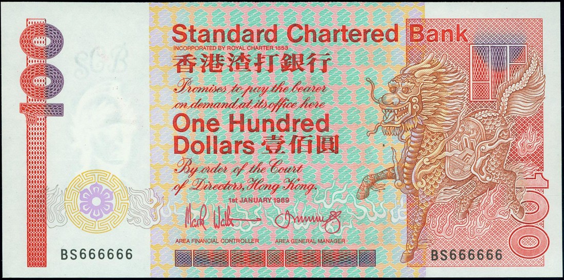 Standard Chartered Bank, $100, 1 January 1989, serial numbers BS666666, red and multicoloured, cantering Qilin at right, helmeted warrior watermark at left, reverse red and green with bank building at left and coat of arms at center, lucky number