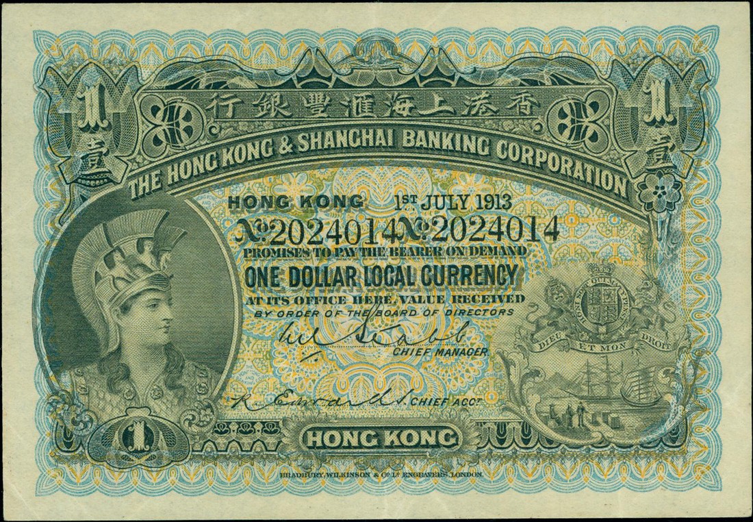 Hong Kong and Shanghai Banking Corporation, $1, 1 July 1913, serial number 2024014, blue and pale orange, head of Minerva at left, arms low right, two printed signature below, reverse orange, maiden with lyre at centre,value at left and right