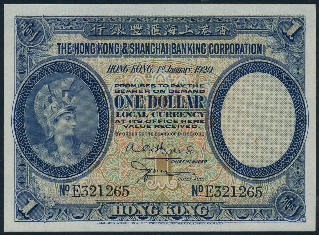Hong Kong and Shanghai Banking Corporation, $1, 1 January 1929, serial number E 321265, blue and orange, helmeted head of Minerva low left, two printed signatures below, reverse purple, maiden with torch