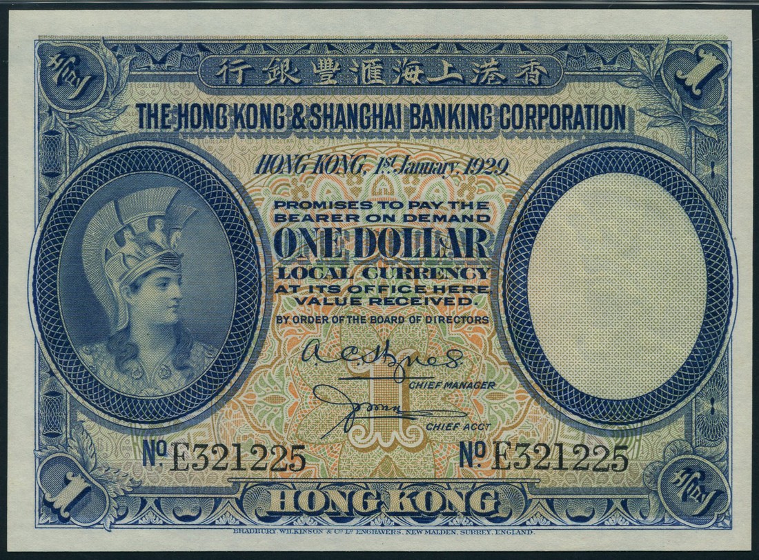 Hong Kong and Shanghai Banking Corporation, $1, 1 January 1929, prefix E, blue and multicoloured, helmeted head of Minerva at left