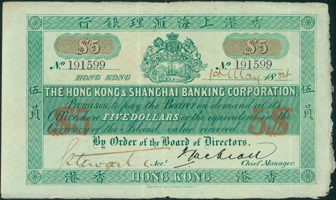 Hong Kong and Shanghai Banking Corporation, $5, 1 May 1884, serial number 191599, green and white, arms of the bank top centre, value in red underprint low left and right, manuscript signature low left and printed signature low right, reverse red and white, arms of the bank at centre, value at left and right