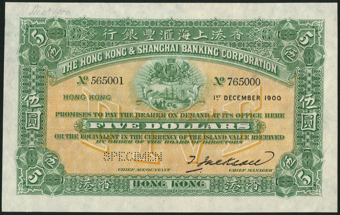 Hong Kong and Shanghai Banking Corporation, specimen $5, 1 December 1901, serial number 565001-765000, green with an orange central panel, arms of the Bank top centre, value in orange underprint low centre, value at each corner, bank title in curve top centre, signature of J.R.M.Smith low right, reverse red and white, allegorical maidens at centre representing commerce and personified by Communications, Industry and Agriculture, value at each corner