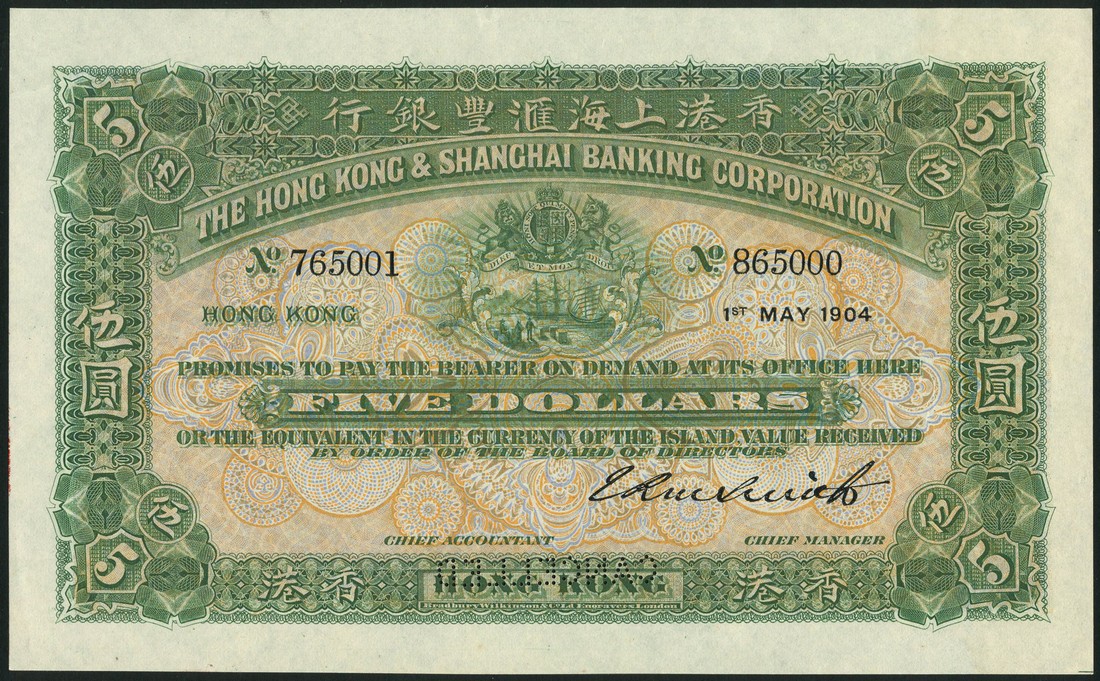 Hong Kong and Shanghai Banking Corporation, specimen $5, 1 May 1904, serial number 765001-865000, green with an orange and pale blue ornate central panel, arms of the Bank top centre, value in orange underprint low centre, value at each corner, bank title in curve top centre, signature of J.R.M.Smith low right, reverse red and white, allegorical maidens with lion at centre representing commerce and personified by Communications, Industry and Agriculture, value at each corner