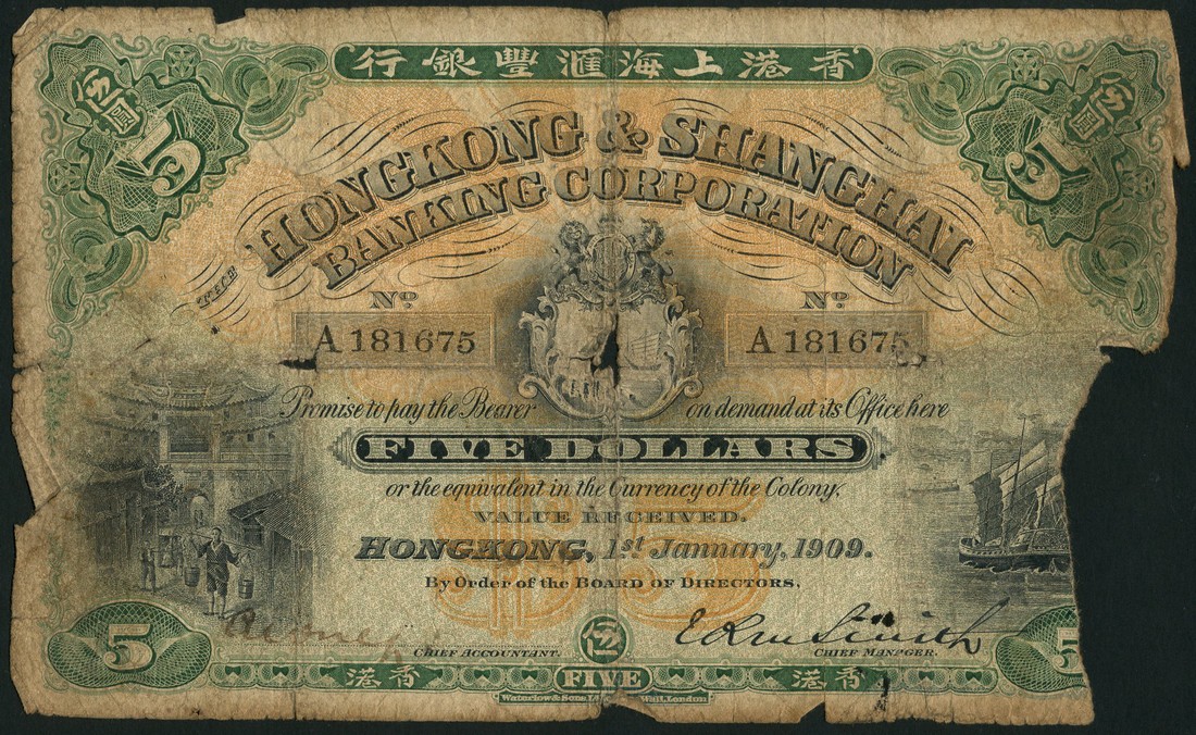 Hong Kong and Shanghai Banking Corporation, $5, Hong Kong, 1 January 1909, serial number A 181675, green and orange, Bank arms and value at centre, value in orange underprint low centre, water carrier, sedan chair and street scene at left, junk at right, manuscript signature low left, printed signature of J R M Smith low right, reverse red, bank building at centre, value at left and right