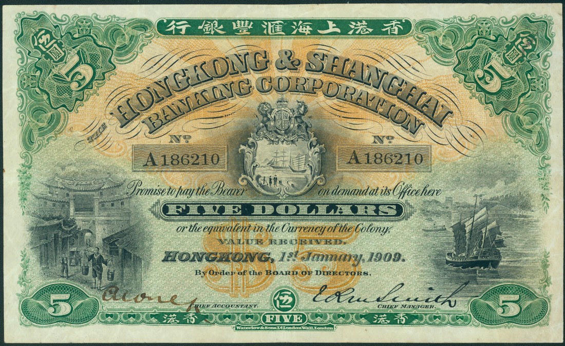 Hong Kong and Shanghai Banking Corporation, $5, 1 January 1909, serial number A 186210, green and pale orange, value in orange low centre, arms at centre, junk at right, water carriers and street scene at left, manuscript signature low left, printed signature of E.R.M.Smith low right, reverse red, bank building at centre, value at left and right