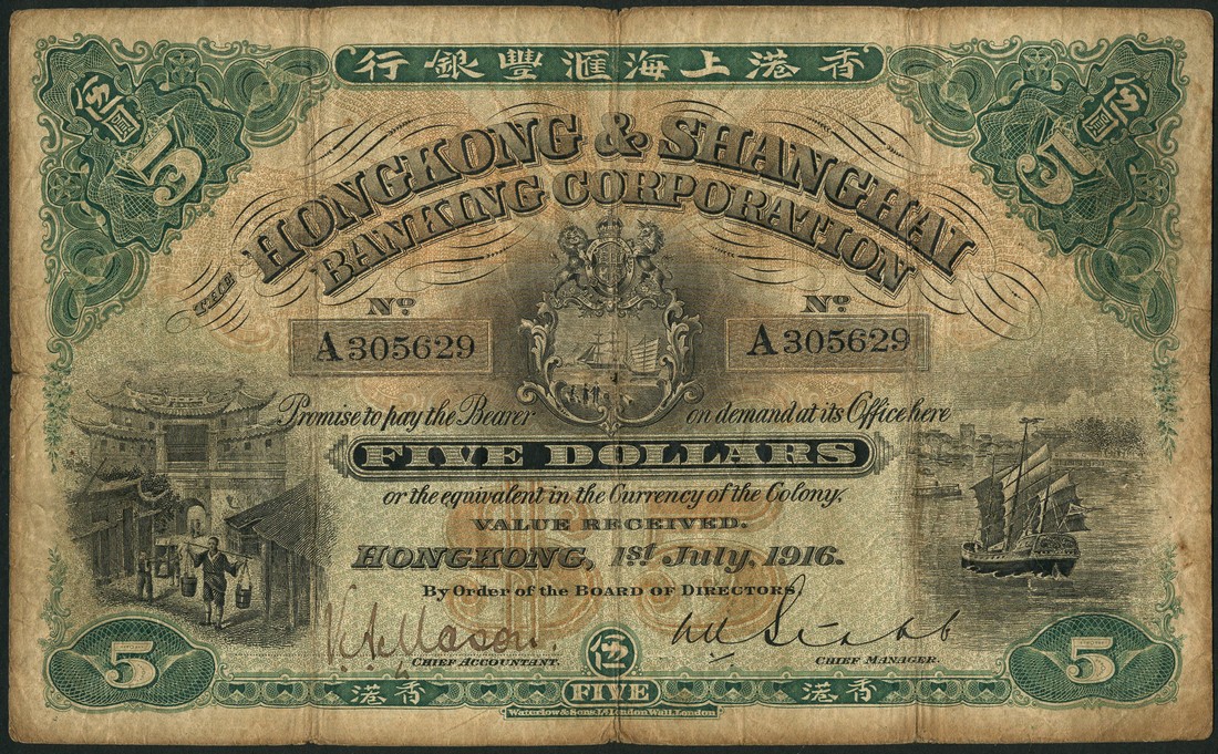 Hong Kong and Shanghai Banking Corporation, $5, Hong Kong, 1 July 1916, serial number A 305629, green and orange, Bank arms and value at centre, value in orange underprint low centre, water carrier, sedan chair and street scene at left, junk at right, manuscript signature low left, printed signature of Stabb (?) at low right, reverse green, bank building at centre, value at left and right