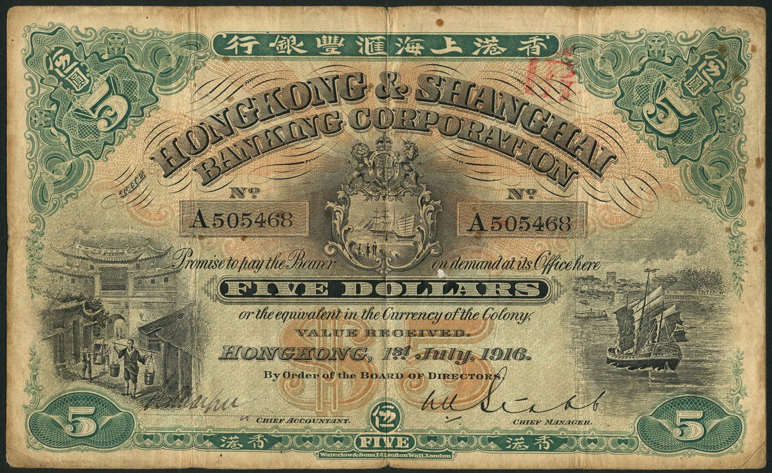 Hong Kong and Shanghai Banking Corporation, $5, Hong Kong, 1 July 1916, serial number A 505468, green and orange, Bank arms and value at centre, value in orange underprint low centre, water carrier, sedan chair and street scene at left, junk at right, manuscript signature low left, printed signature of Stabb (?) at low right, reverse green, bank building at centre, value at left and right