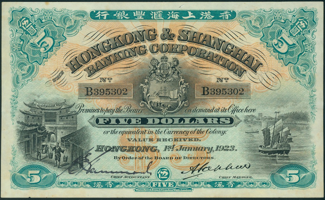 Hong Kong and Shanghai Banking Corporation, $5, 1 January 1923, serial number B 395302, green and pale orange, value in orange low centre, arms at centre, junk at right, water carriers and street scene at left, manuscript signature low left, printed signature of A.Stephen low right, reverse green and brown, bank building at centre, value at left and right
