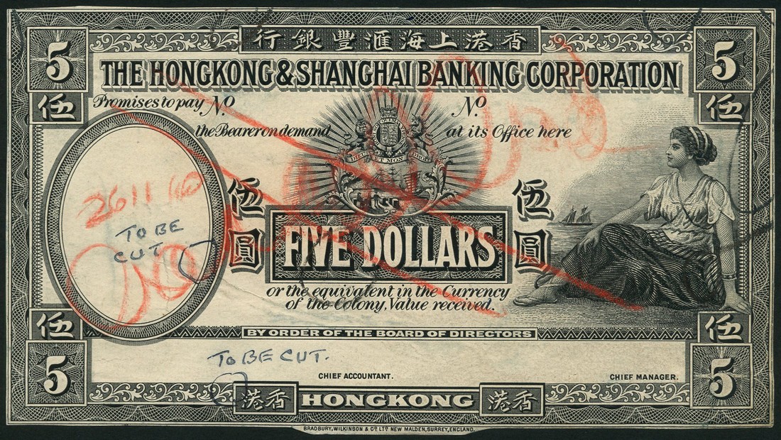 Hong Kong and Shanghai Banking Corporation, obverse and reverse die proof for $5, Hong Kong, ND (c.1927), black and white, maiden at right, arms at centre, reverse black and white, bank building and angel