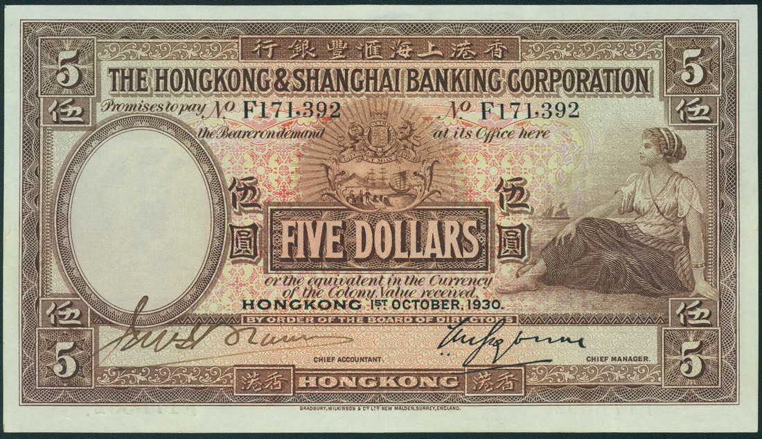 Hong Kong and Shanghai Banking Corporation, $5, 1 October 1930, serial number F 171392, brown and multicoloured, maiden reclining at right, arms at centre, manuscript signature low left, printed signature of Vandeleur Grayburn low right, reverse brown, bank building at centre, an angel above, value at left and right