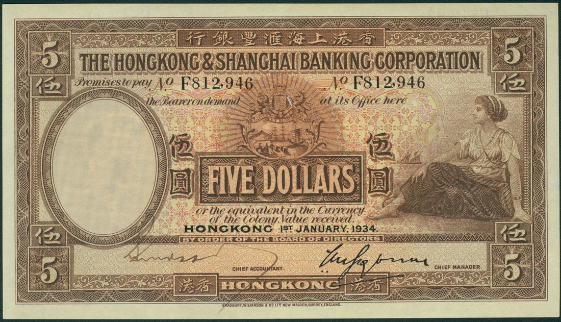 Hong Kong and Shanghai Banking Corporation, $5, 1 January 1934, serial number F 812964, brown and multicoloured, maiden reclining at right, arms at centre, manuscript signature low left, printed signature of Vandeleur Grayburn low right, reverse brown, bank building at centre, an angel above, value at left and right
