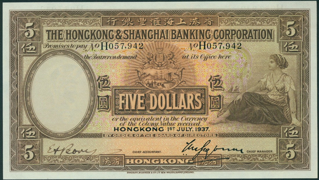 Hong Kong and Shanghai Banking Corporation, $5, 1 July 1937, serial number H 057942, brown and multicoloured, maiden reclining at right, arms at centre, manuscript signature low left, printed signature of Vandeleur Grayburn low right, reverse brown, bank building at centre, an angel above, value at left and right