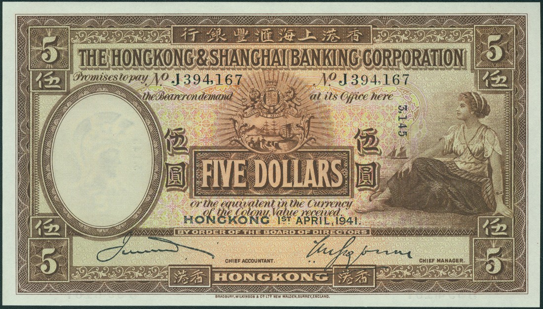 Hong Kong and Shanghai Banking Corporation, $5, 1 April 1941, serial number J 394167, brown and multicoloured, maiden reclining at right, arms at centre, additional number 3145 in right field, printed signature low left and printed signature of Vandeleur Grayburn low right, reverse brown, bank building at centre, an angel above, additional number 3145 in right field, value at left and right