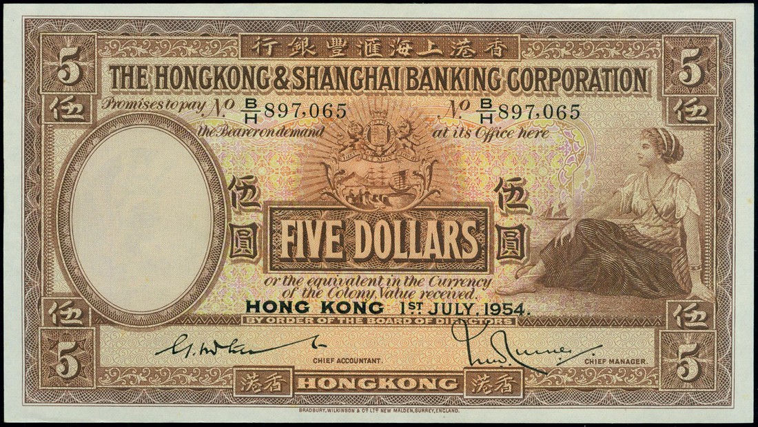 Hong Kong and Shanghai Banking Corporation, $5, 1 July 1954, serial numbers B/H 897065-068, brown on multicoloured underprint, maiden at left, coat of arms and value at centre, watermark of helmeted warrior at left, reverse brown, HSBC building at centre