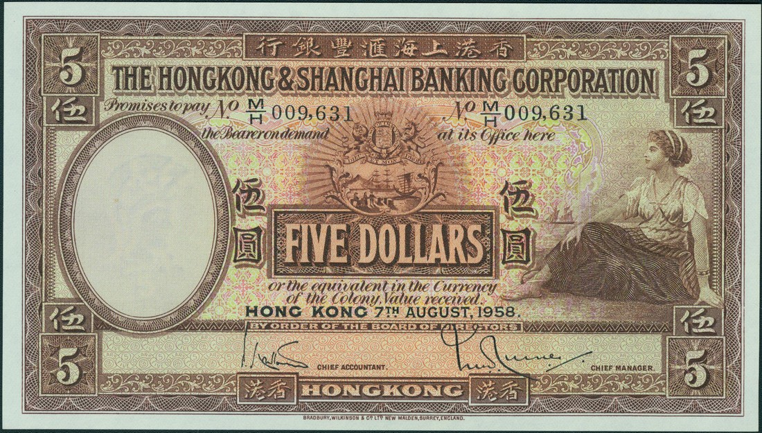 Hong Kong and Shanghai Banking Corporation, $5, 7 August 1958, consecutive run of 10, serial number, M/H009631-009640, brown and multicoloured, maiden at right, arms top centre, two printed signatures below, reverse brown, bank head office and angel above