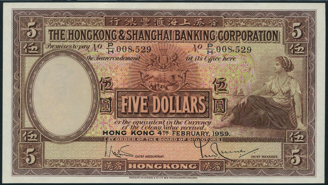 Hong Kong and Shanghai Banking Corporation, $5, 4 February 1959, serial number P/H 008529, brown and multicoloured, maiden at right, arms at centre, two printed signatures below