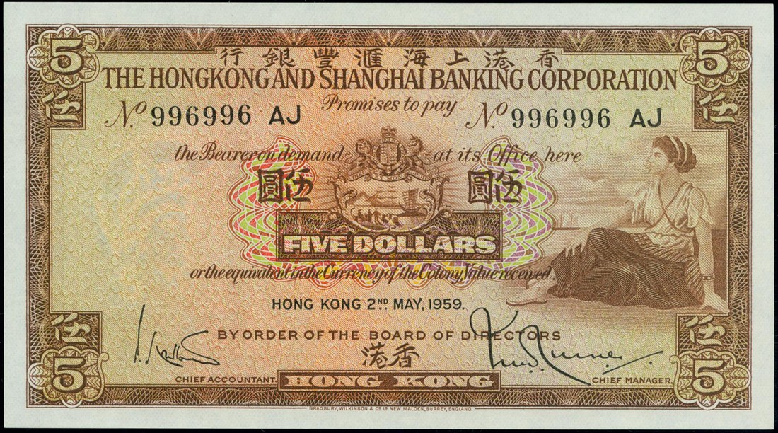 Hong Kong and Shanghai Banking Corporation, $5, 2 May 1959, consecutive run of 5, serial number 996996 AJ to 996700, brown and multicoloured, maiden at right, arms top centre, two printed signatures below, reverse brown, bank head office and angel above