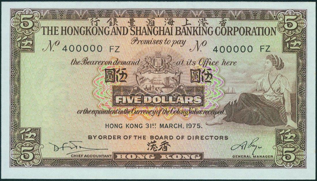 Hong Kong and Shanghai Banking Corporation, $5, 31 Mar 1975, serial number 400000 FZ, brown and multicoloured, maiden at right, arms top centre, two printed signatures below, reverse brown, bank head office and angel above