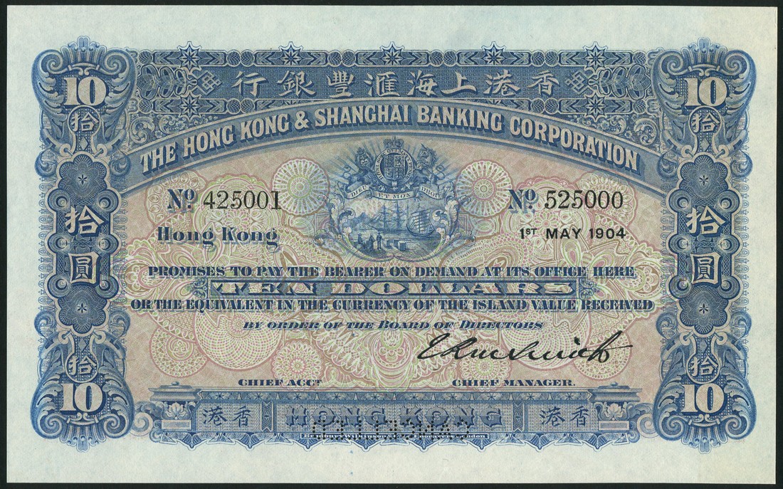 Hong Kong and Shanghai Banking Corporation, specimen $10, 1 May 1904, serial number 425001-525000, blue with a lilac and green ornate central panel, arms of the Bank top centre, value in blue at centre, value at each corner, bank title in curve top centre, signature of J.R.M.Smith low right, reverse red and white, Mercury and Britannia at centre with symbols of commerse, medallic head of Britannia at left and right, value at each corner, allegorical maidens with lion at centre representing commerce and personified by Communications, Industry and Agriculture, value at each corner