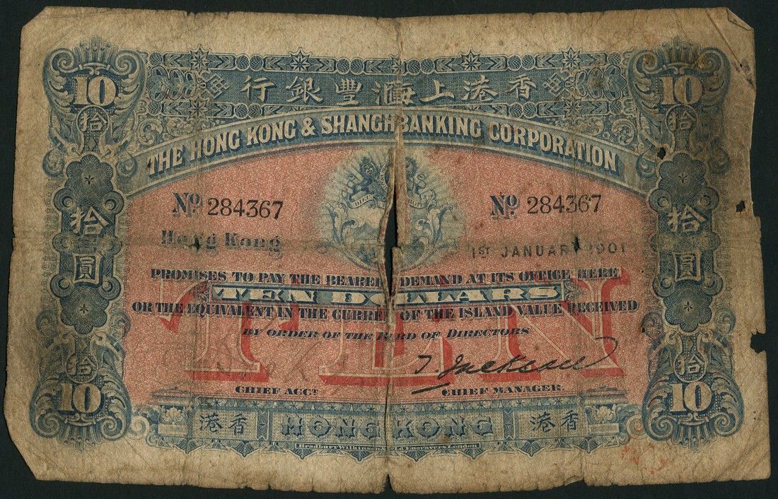 Hong Kong and Shanghai Banking Corporation, $10, Hong Kong, 1 December 1900, serial number 284367 blue with a pink-red central panel, Bank arms and vaue at centre, value in underprint low centre and value at each corner, manuscript signature low left, printed signature of Thomas Jackson low right, reverse red, Mercury and Britannia at centre with symbols of commerce, medallic female head at left and right
