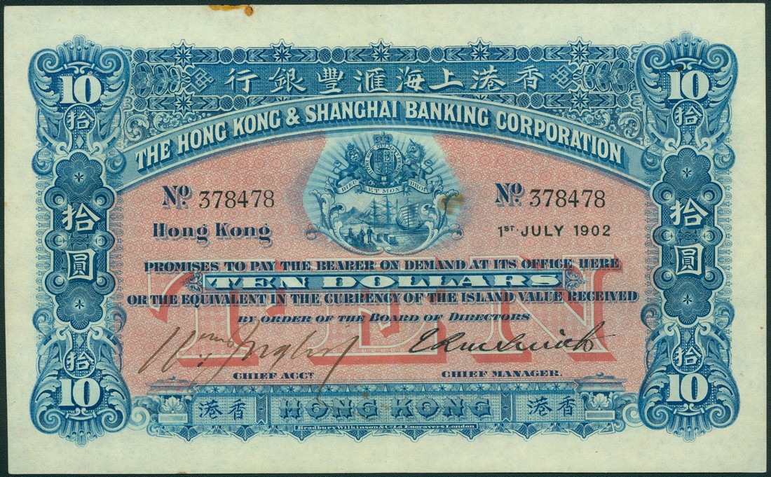 Hong Kong and Shanghai Banking Corporation, $10, 1 July 1902, serial number 378478, blue and pink-red, value in pink-red underprint low centre, arms top centre, value at centre and at each corner, manuscript signature low left, printed signature of E.R.M.Smith low right, reverse red, Mercury and Britannia at centre in circular frame with bank title around, helmeted female head at left and right, value at each corner