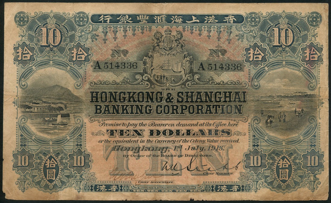 Hong Kong and Shanghai Banking Corporation, 10 dollars, 1 July 1913, serial number A514336, blue on red underprint, waterfront at right, horseman and walkers at right, reverse olive green and brown,