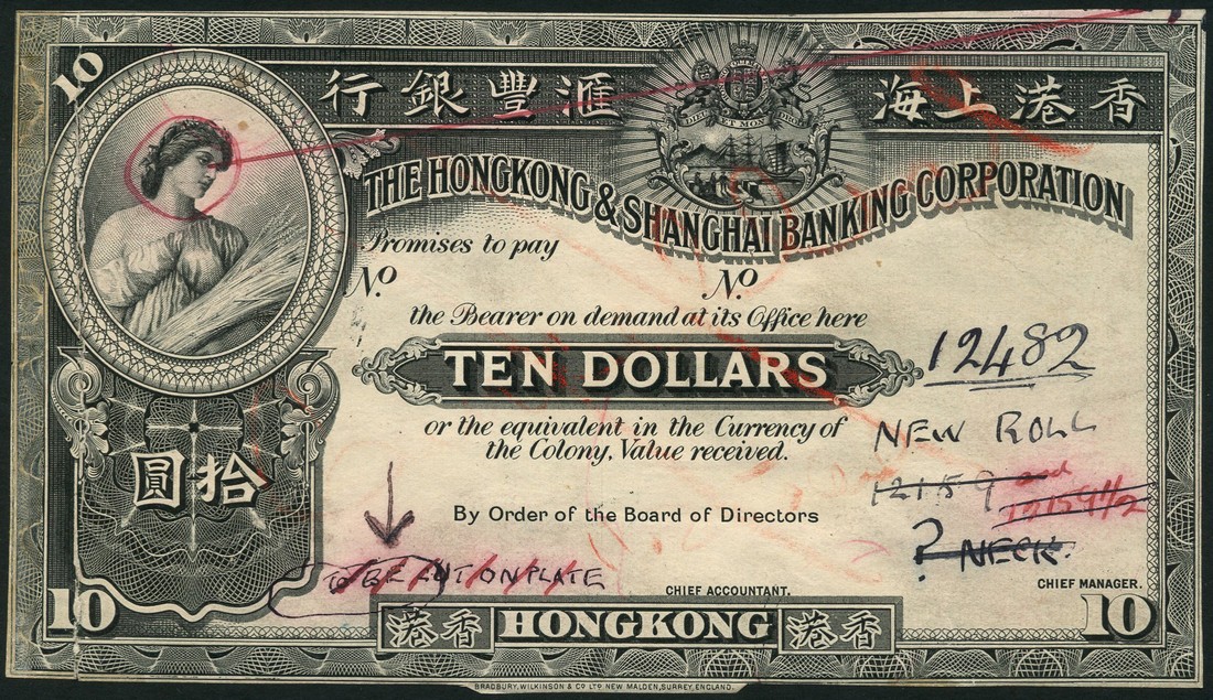 Hong Kong and Shanghai Banking Corporation, obverse and reverse die proof for $10, Hong Kong, ND (c.1927), black and white, Ceres top left, arms at top centre, reverse black and white, bank building and angel