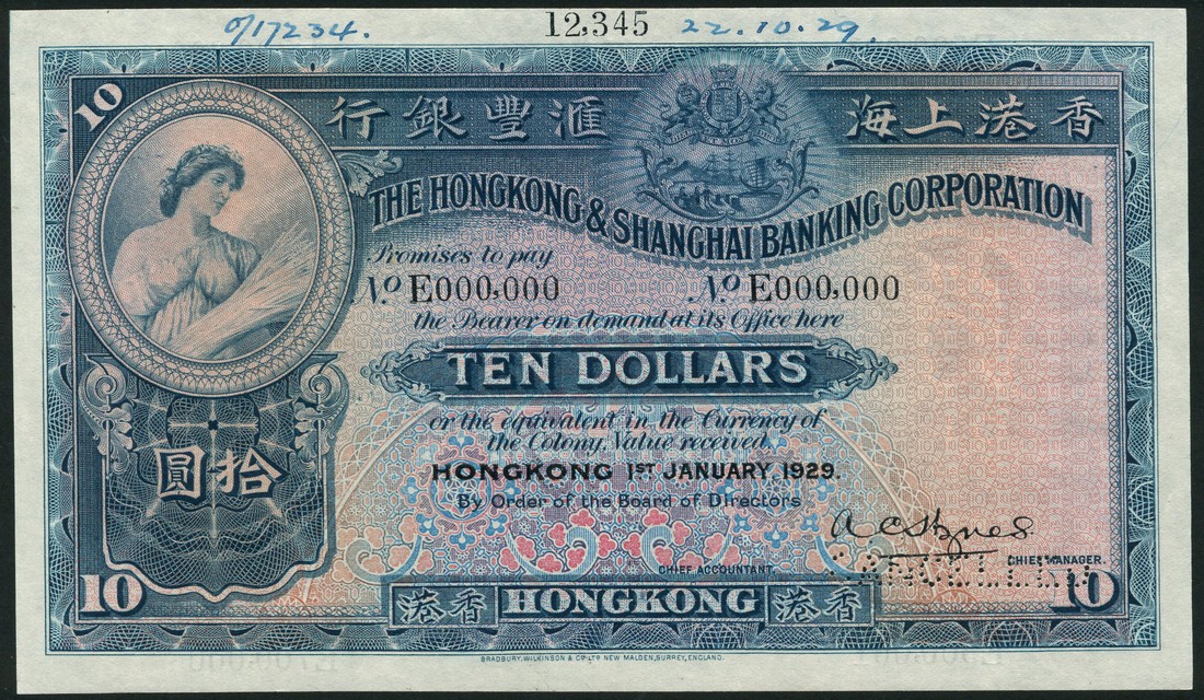 Hong Kong and Shanghai Banking Corporation, specimen $10, 1 October 1927, serial number E 000000, blue-green and pink, maiden (Ceres) top left in circular frame, Bank arms top right centre, signature of A.C.Hynes low right, reverse blue-green and multicoloured, Bank building at centre, angel above, value at each corner