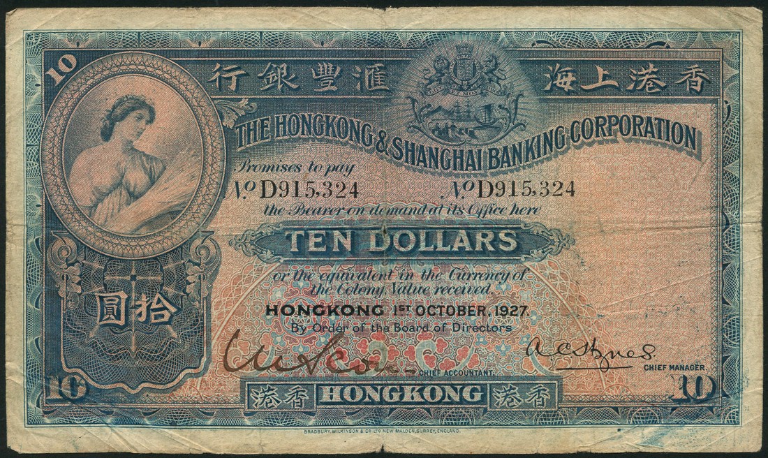 Hong Kong and Shanghai Banking Corporation, $10, 1 October 1927, serial number D 915324, blue and pink and pale blue, Ceres top left, arms of the bank top right centre, manuscript signature low left, printed signature of A.C.Hynes low right, reverse blue and multicoloured, the bank head office at centre with an angel and trumpet above, value at left and right