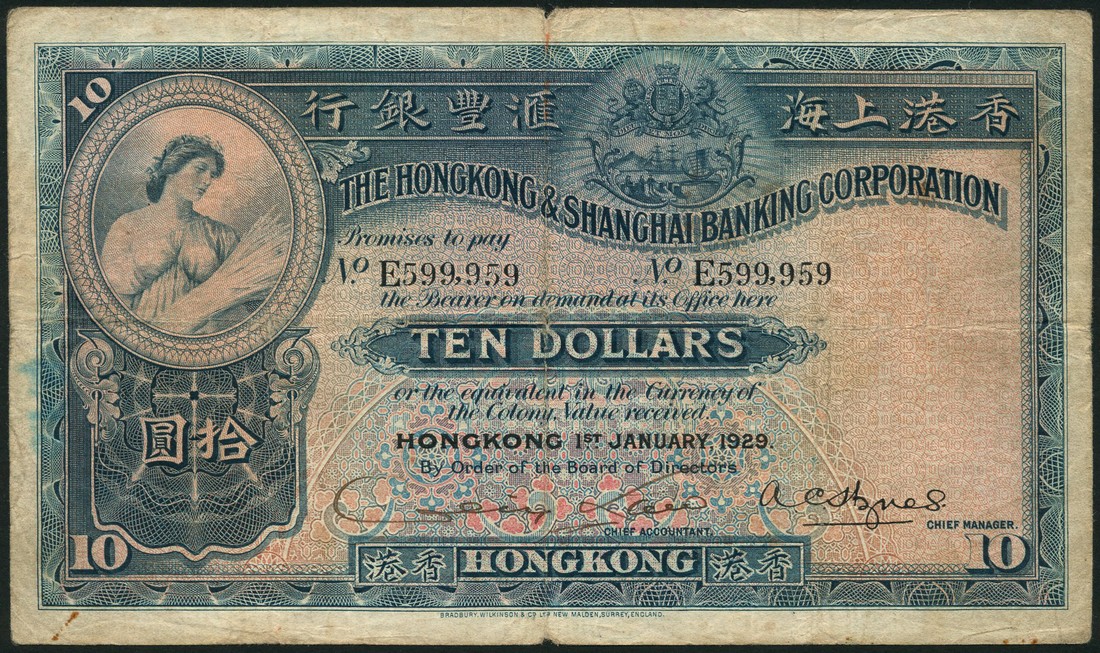 Hong Kong and Shanghai Banking Corporation, $10, 1 October 1927, serial number E 599959, blue and pink and pale blue, Ceres top left, arms of the bank top right centre, manuscript signature low left, printed signature of A.C.Hynes low right, reverse blue and multicoloured, the bank head office at centre with an angel and trumpet above, value at left and right