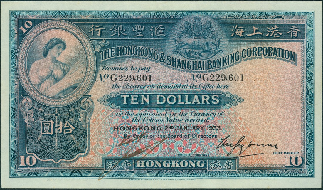 Hong Kong and Shanghai Banking Corporation, $10, 2 January 1933, serial number G 229601, blue-green and pink, Ceres top left, arms top right centre, manuscript signature low left, printed signature of Vandeleur Grayburn low right, reverse blue-green, serial number at each corner, bank building at centre, an angel above