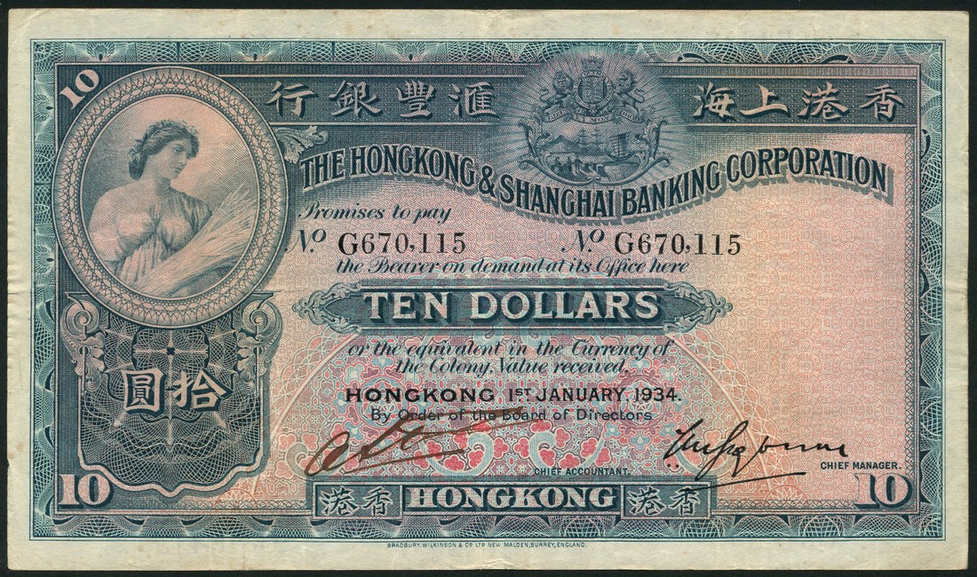 Hong Kong and Shanghai Banking Corporation, specimen $10, 1 January 1934, serial number G 670115, blue and pink and pale blue, Ceres top left, arms of the bank top right centre, manuscript signature low left, printed signature of V.M.Grayburn low right, reverse blue and multicoloured, the bank head office at centre with an angel and trumpet above, value at left and right