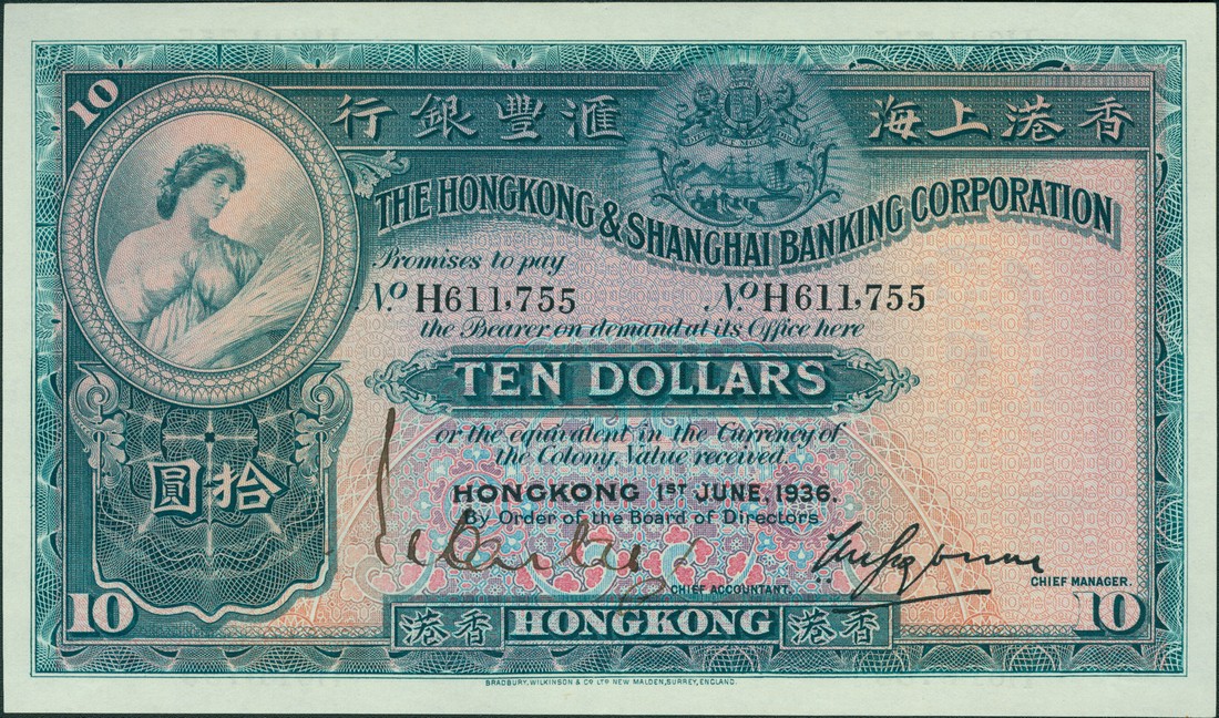 Hong Kong and Shanghai Banking Corporation, $10, 1 June 1936, serial number H 611755, blue-green and pink, Ceres top left, arms top right centre, manuscript signature low left, printed signature of Vandeleur Grayburn low right, reverse blue-green, serial number at each corner, bank building at centre, an angel above