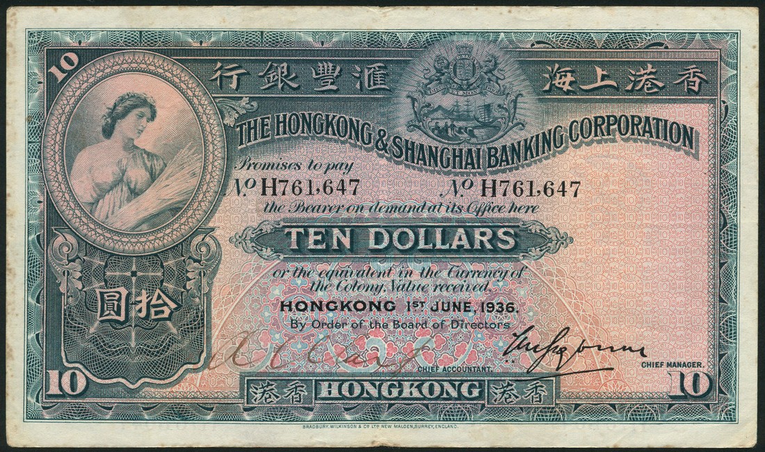 Hong Kong and Shanghai Banking Corporation, specimen $10, 1 January 1936, serial number H 761647, blue and pink and pale blue, Ceres top left, arms of the bank top right centre, manuscript signature low left, printed signature of V.M.Grayburn low right, reverse blue and multicoloured, the bank head office at centre with an angel and trumpet above, value at left and right