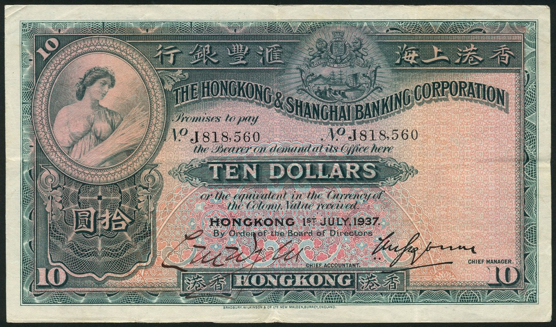 Hong Kong and Shanghai Banking Corporation, $10, 1 January 1937, serial number J 818560, blue and pink and pale blue, Ceres top left, arms of the bank top right centre, manuscript signature low left, printed signature of V.M.Grayburn low right, reverse blue and multicoloured, the bank head office at centre with an angel and trumpet above, value at left and right