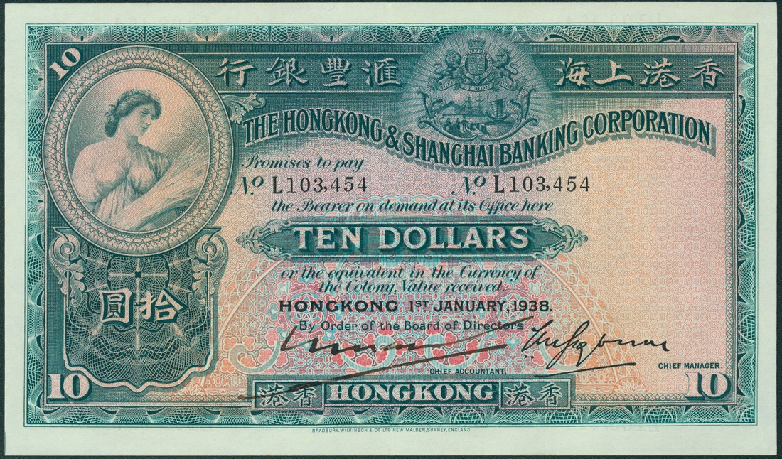 Hong Kong and Shanghai Banking Corporation, $10, 1 January 1938, serial number L 103454, blue-green and pink, Ceres top left, arms top right centre, manuscript signature low left, printed signature of Vandeleur Grayburn low right, reverse blue-green, serial number at each corner, bank building at centre, an angel above