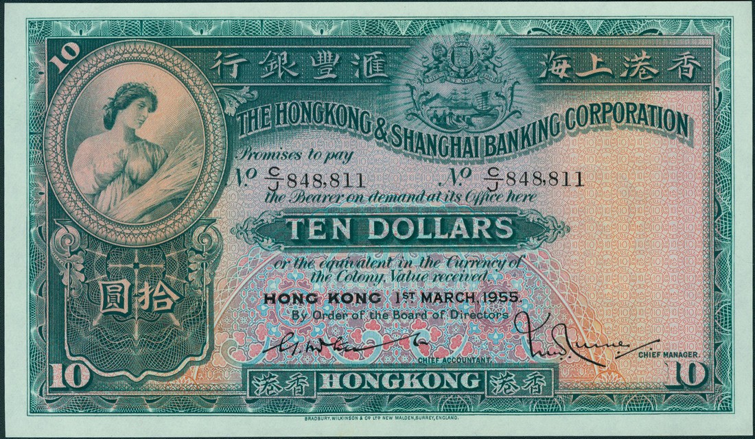 Hong Kong and Shanghai Banking Corporation, $10, 1 Mar 1955, consecutive run of 10, serial number C/J 848811-848820, dark green and multicoloured, maiden( Ceres ) top left, arms top right, two printed signatures below, reverse green and orange, bank building at centre, angel above