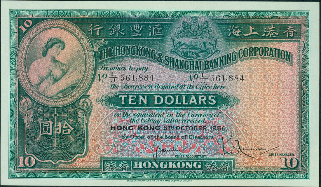 Hong Kong and Shanghai Banking Corporation, $10, 5 Oct 1956, consecutive run of 13, serial number L/J 561884-561896, dark green and multicoloured, maiden (Ceres) top left, arms top right, two printed signatures below, reverse green and orange, bank building at centre, angel above