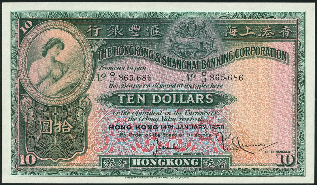 Hong Kong and Shanghai Banking Corporation, $10 (2), 1956, 1958, prefixes K/J and Q/J, blue and pink and pale blue, Ceres top left, arms of the bank top right centre, two printed signatures below, reverse blue and multicoloured, the bank head office at centre with an angel and trumpet above, value at left and right