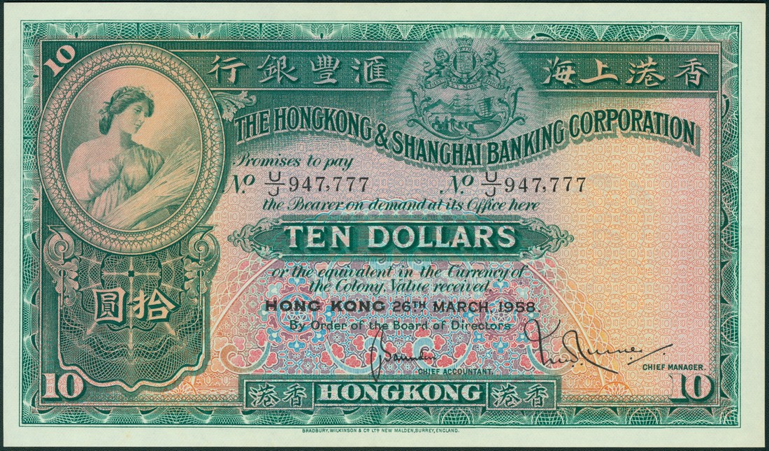 Hong Kong and Shanghai Banking Corporation, $10, 26 March 1958, serial number U/J 947777, blue-green and pink, Ceres top left, arms top right centre, two printed signatures below, reverse blue-green, no serial numbers at each corner, bank building at centre, an angel above