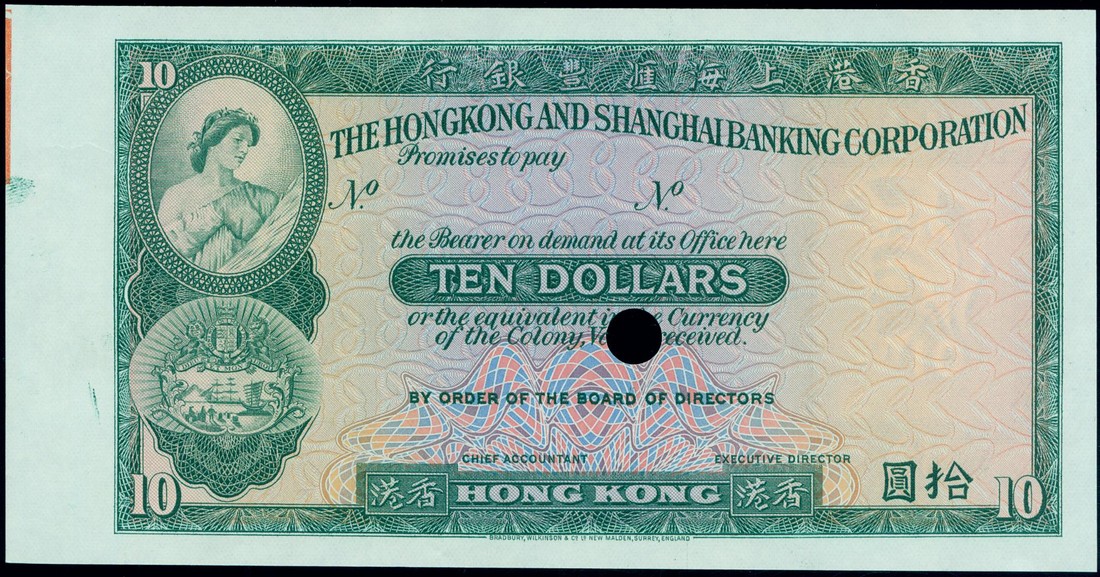 Hong Kong & Shanghai Banking Corporation, proof $10, ND (issued from 1959-1983), no serial numbers, dark green on multicolour underprint, maiden at top left, arms at low left, value at centre and each corner
