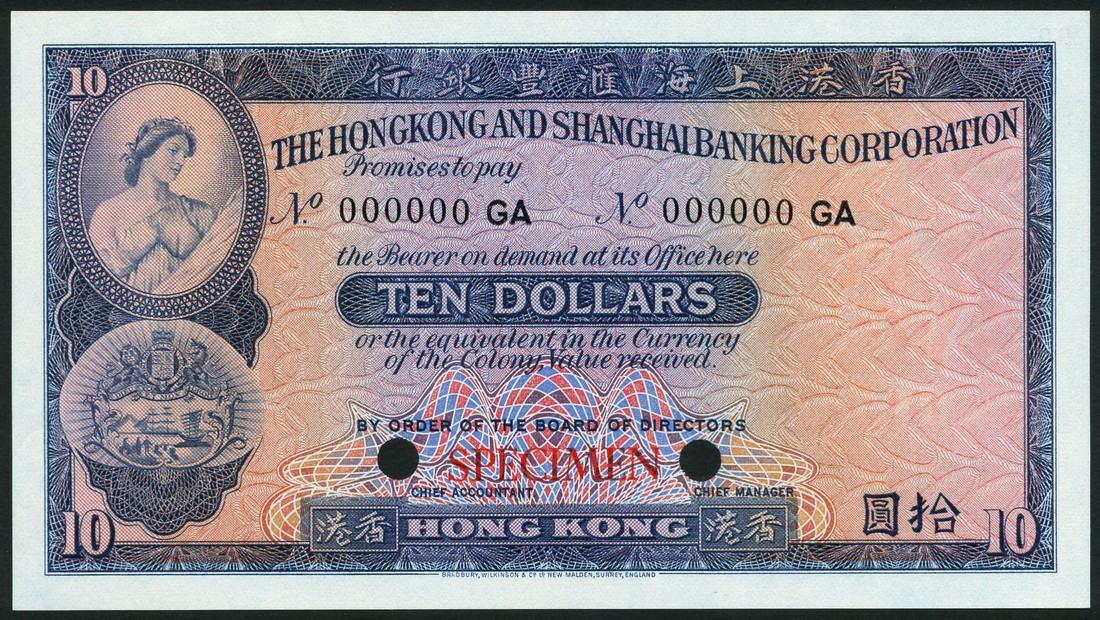 Hong Kong and Shanghai Banking Corporation, colour trial $10, ND (type of 1959), serial nummber 000000 GA, blue and pink and lilac, Ceres top left, arms of the bank low left, two printed signatures below, reverse blue and multicoloured, the bank head office at centre with an angel and trumpet above, value at left and right