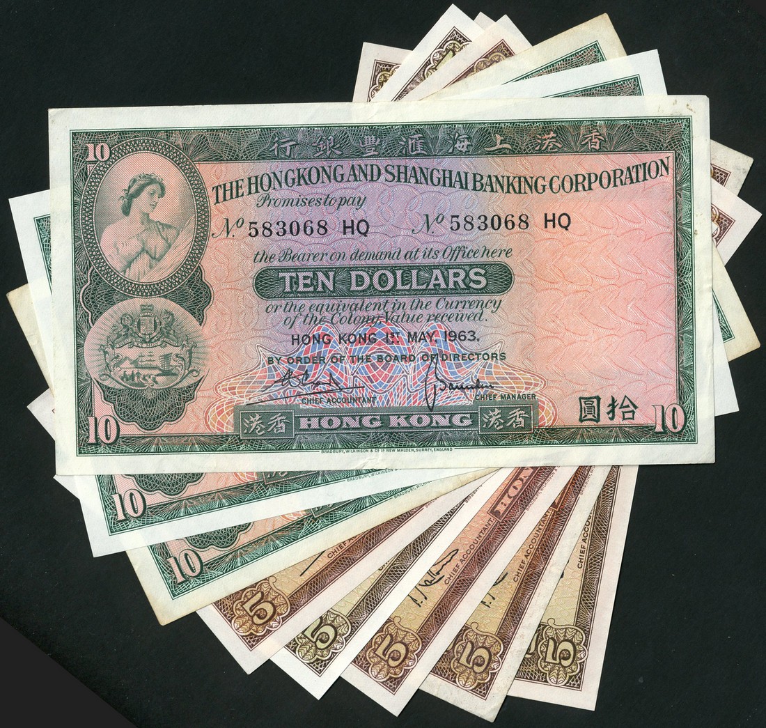 Hong Kong and Shanghai Bank Corporation, $5 (5), 1960 (2), 1963,1971,1973, brown, arms top centre, maiden at right, the 1973 with serial number 007772 FF, also $10 (3), 1963,1964,1967, green, Ceres and arms at left