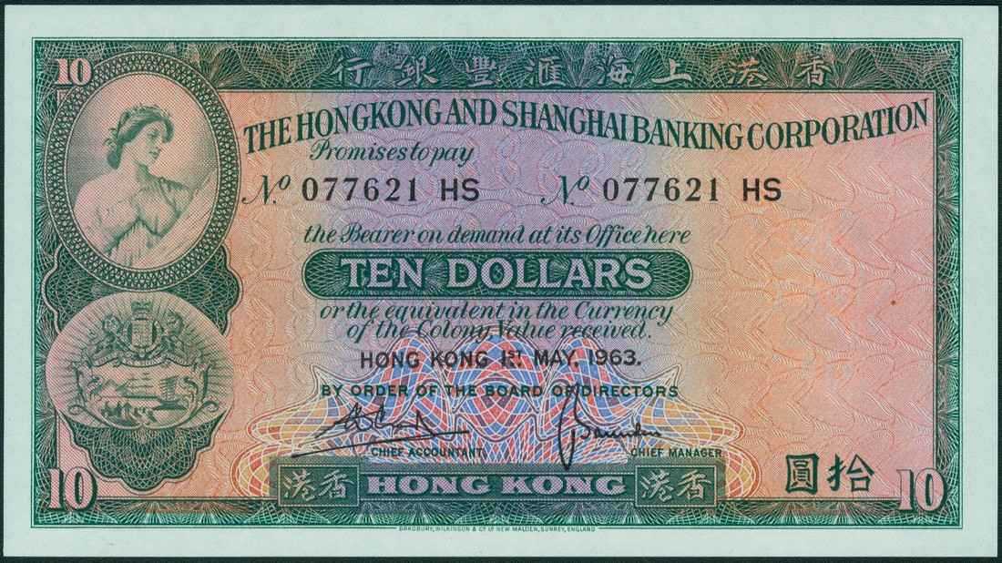 Hong Kong and Shanghai Banking Corporation, $10 (25), 1 May 1963, consecutive run of 20 and 4, serial number 077621 HS-077640, 077647-50, and 1 Sept 1963, serial number 933221 HX, green and multicoloured, maiden( Ceres ) and arms at left, two printed signatures below, reverse green, bank building at centre, angel above